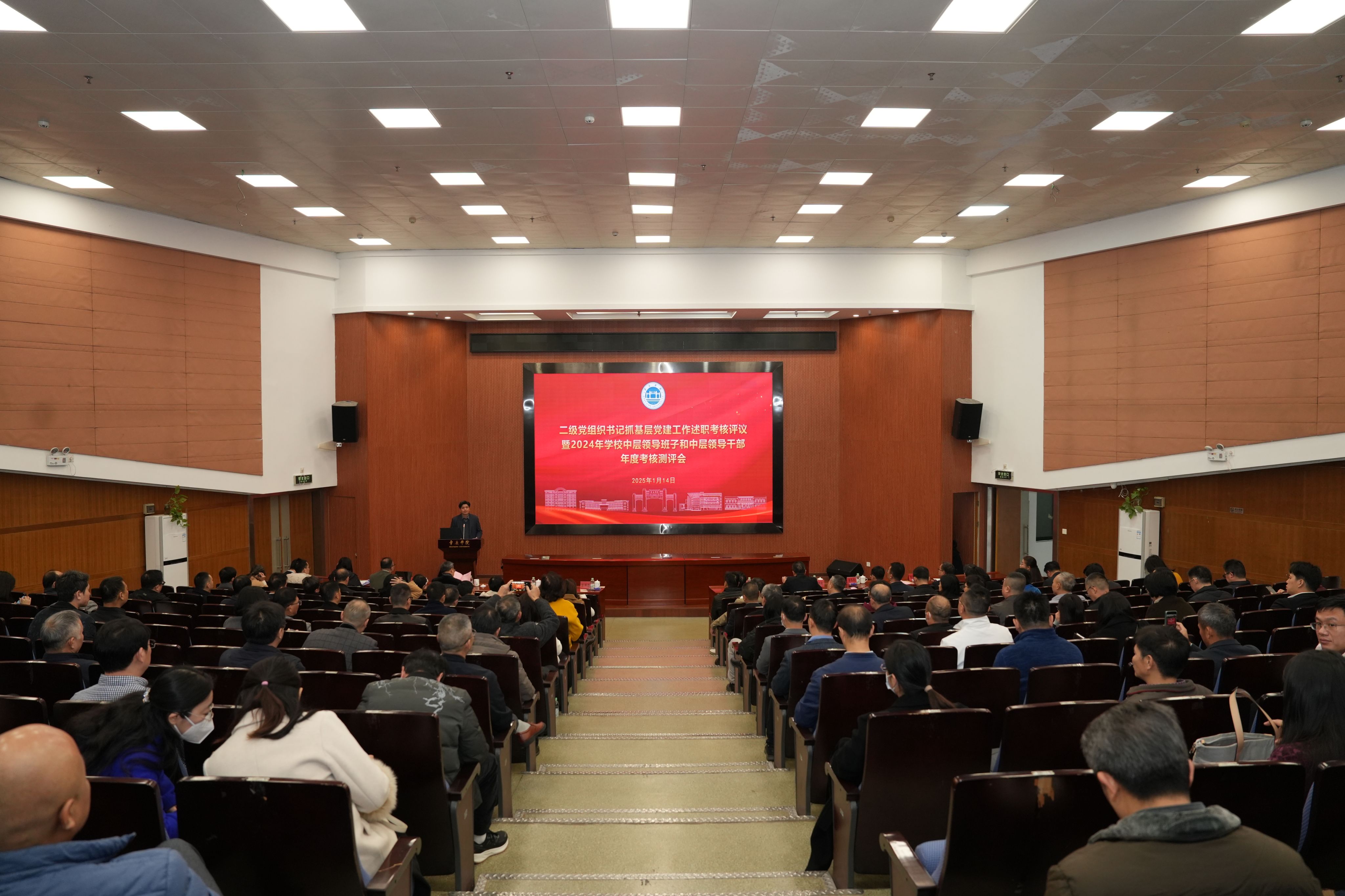 本网讯 1月14日,学校举行二级党组织书记抓基层党建工作暨2024年中层正职领导干部年度考核述职会议。学校领导、党委委员、学校中层领导干部考核小组成员、党风廉政建设责任制领导小组全体成员以及全体中层领导干部参加会议。学校党委书记谢冠华进行点评并讲话,校党委副书记欧洪湛主持会议。