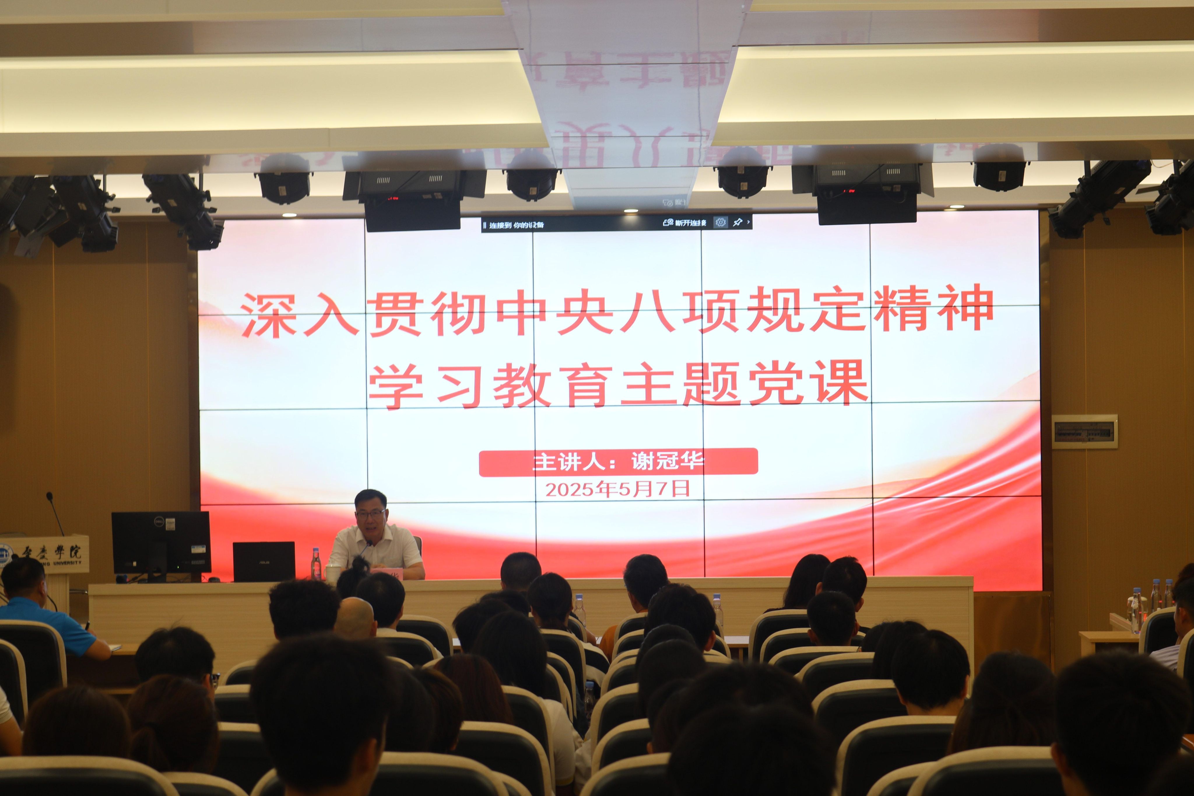 在授课过程中,谢冠华从大历史观的视角出发,带领大家回顾了中华民族的悠久历史和伟大复兴的进程。他强调,中国共产党之所以能够在百年风雨中依然风华正茂,正是依靠“人民监督政府”和“党的自我革命”这“两个答案”,维护了国家的长治久安。谢冠华指出,当前全党上下正在深入开展贯彻中央八项规定精神的学习教育,旨在持续巩固和深化主题教育和党纪学习教育的成果,推进全面从严治党,进一步引导全校党员、干部牢固树立纪律意识,抓好作风建设,为推动学校高质量发展提供坚实保障。