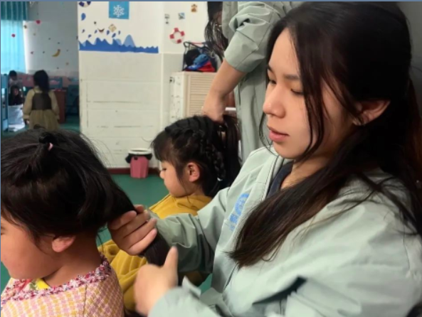 初次接触幼儿园教学,慢慢了解到原来幼儿园的一日生活即教育,我在小班担任配班老师时,孩子们午睡起床需要老师讲解如何穿衣服和穿鞋子,老师要帮孩子们叠被子,到了中班则是孩子们自己叠,到了大班孩子们就都能自己完成起床的全部步骤了。还没有给小朋友扎过头发的我,在和同事老师学习并尝试了几次后也渐渐上手了,小朋友对叶老师版的“爱心头”都很感兴趣,爱心头简单又可爱,就像小朋友对老师们的爱。每当想起小朋友们可爱的小脸,我的心里都是甜滋滋的。
