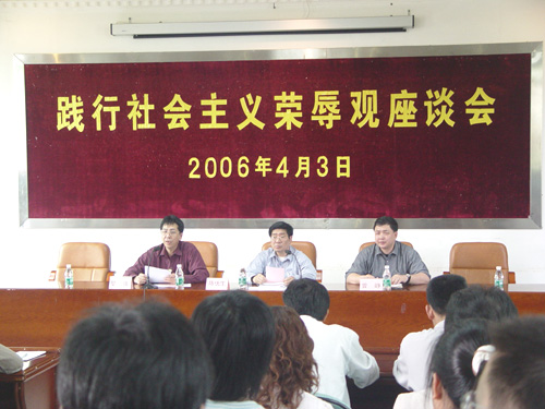 4月3日下午,2005级新生临时党支部在第二会议室举行了践行社会主义荣辱观座谈会。党委书记陈优生、党委副书记曾峥等学校领导,党委组织部部长黎强等有关部门负责人,各系政治辅导员和新生临时党支部的学生党员出席了座谈会。 至此,为期7个月的临时党支部学习教育和实践活动圆满结束。