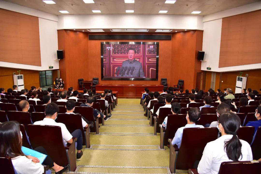 在观看庆祝大会直播前,1000名师生代表齐聚国砚广场,出席学校举行的升旗仪式。仪式中,全场师生向冉冉升起的国旗行注目礼,然后齐声唱响《没有共产党就没有新中国》,共同庆祝中国共产党百年华诞,祝福伟大的祖国繁荣富强。