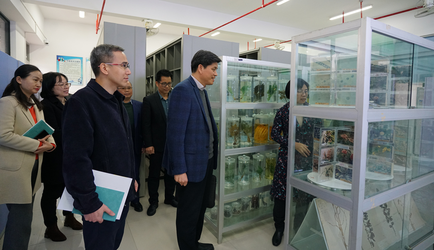 座谈会后,欧洪湛走访生科院教师办公室,参观动植物标本室,对生命科学与健康教育基地的发展规划提出建议。