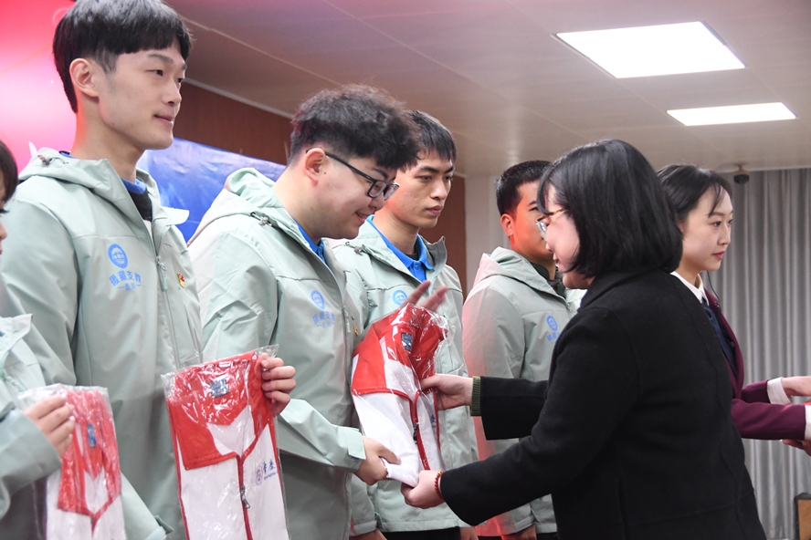团委书记马舒洁向师生赠送志愿者服