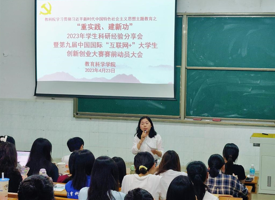 本网讯 近日,教育科学学院在星湖校区举行“重实践、建新功”2023年学生科研经验分享会暨第九届中国国际“互联网+”大学生创新创业大赛赛前动员大会。国家级大创项目负责人、小学教育专业黄妙等3名优秀同学担任主讲人,2022级170多名学生参加分享。