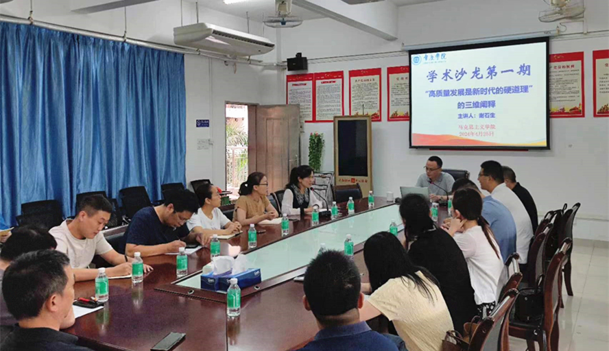 本网讯 为了营造浓厚的学术氛围,促进师生开展学术研究,4月25日,马克思主义学院首期学术沙龙以“‘高质量发展是新时代的硬道理’的三维阐释”为主题开讲。副院长谢石生担任主讲嘉宾。学院部分教师、科研项目负责人等参加,副院长林润燕主持。